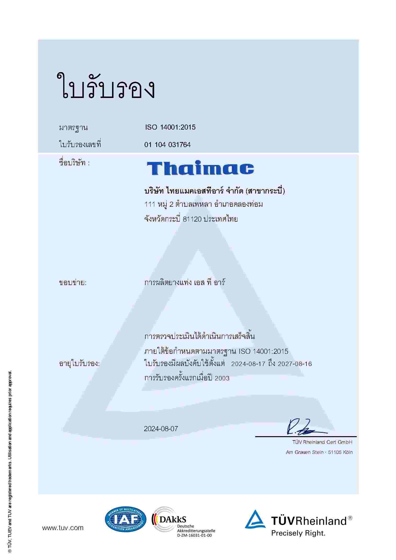 | STR | ThaiMac(ISO 14001:2015) | BS | 16/08/2027 | View | View |